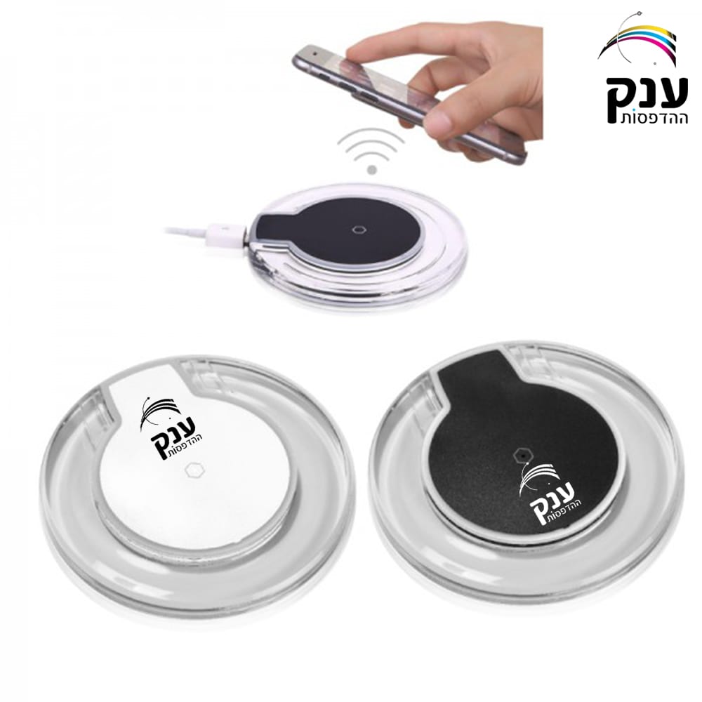משטח טעינה אלחוטי תקן QI דגם AK415 מתאים לכל המכשירים התומכים בטעינה אלחוטית קוטר 10 ס"מ, בצבע לבן/שחור, כולל מיתוג לוגו צבע אחד